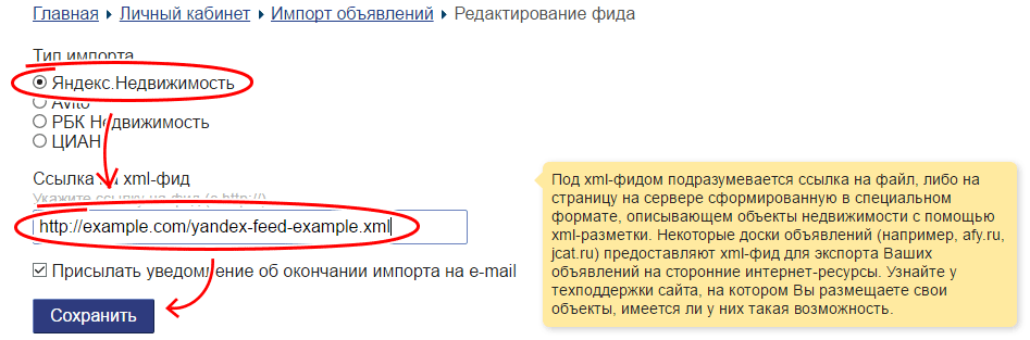 Наш сайт поддерживает несколько популярных форматов для xml-выгрузки: Яндекс.Недвижимость, Avito, РБК, ЦИАН. Ваш xml-фид должен быть в одном из этих форматов.